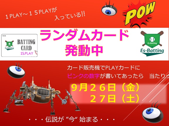 今月も1PLAY~15Playが出る🌟ランダムカード発進🚙🚙🚙 本日も1本!! Es-Battingでお待ちしてます⚾ 伝説が”今”始まる